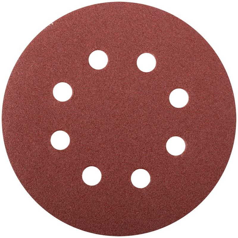 Круги шлифовальные с отверстиями (липучка), алюминий-оксидные, 125 мм, 5 шт Р 100 - 39665 FIT - это набор из 5 кругов для шлифовки с диаметром 125 мм. Они имеют хлопчатобумажную основу с липучкой и 8 отверстиями. Эти круги предназначены для обработки плоских поверхностей и идеально подходят для использования с электрическими эксцентриковыми шлифмашинами с пылеотводом.
