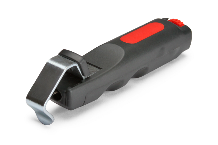 Инструмент для снятия изоляции КС-28у серия ПРОФИ совместим с любыми круглыми кабелями и проводами диаметром от 6 до 28 мм. Для работы достаточно поместить кабель между губками инструмента, закрепить его металлической скобой и провести инструмент вдоль поверхности. Нож автоматически поворачивается при смене направления движения, что исключает необходимость перехватывать инструмент. Регулировка глубины осуществляется вращением колесика на рукоятке - достаточно установить нужную отметку перед началом работы.
