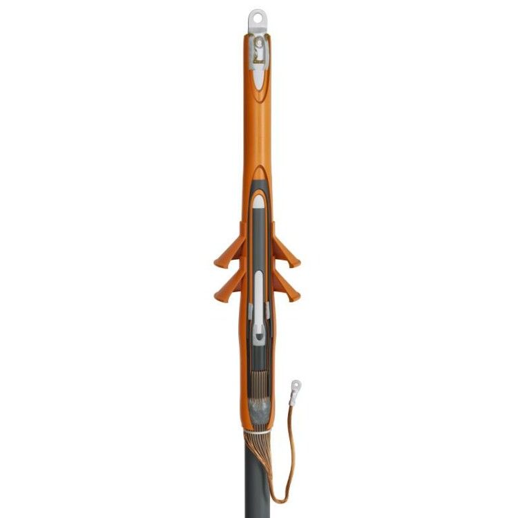 Заземляющий провод формируется из медного проволочного экрана самого кабеля - специальный наконечник под опрессовку в комплект не входит. Болтовые наконечники уже установлены в муфте и рассчитаны на работу при 35 кВ. Установка выполняется в один этап: подготовка кабеля, насадка компонентов, прогрев. После усадки термоплавкий клей внутри трубки создаёт полностью герметичное соединение.