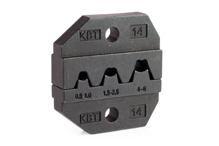 Матрица для опрессовки изолированных наконечников МПК-14 серия ПРОФИ от КВТ - сменная оснастка для надёжного обжима медных наконечников сечением 0,5–6 мм2, совместимая с пресс-клещами СТК, СТВ и СТА. Обеспечивает двойной обжим: по жиле и изоляции, что повышает долговечность соединений.