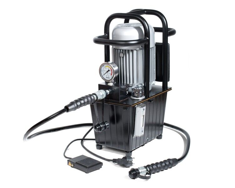 ПМЭ-7050 серия ПРОФИ совместима с любыми гидравлическими инструментами, имеющими присоединительную резьбу K 3/8" «вилка». Рукав длиной 1.8 м позволяет свободно перемещаться вокруг рабочего места. Для подключения достаточно вставить штуцер в инструмент и закрутить резьбовое соединение до упора - никаких специальных инструментов не требуется. Электродвигатель запускается кнопкой на пульте; работа начинается после нажатия на ножной пульт. Перед первым использованием проверьте уровень масла - он должен находиться между метками на индикаторе.