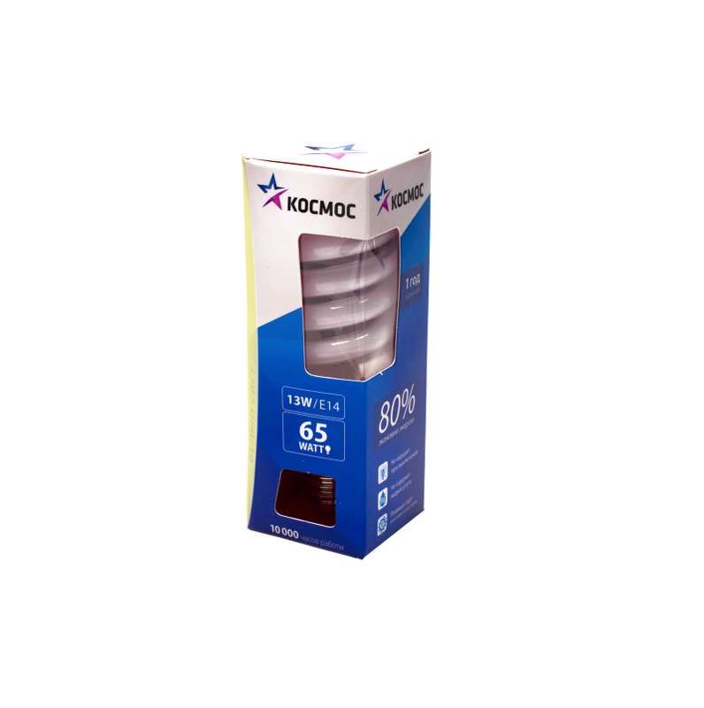Лампа люминесцентная компактная 13 Вт E14 спиральная 2700 К от бренда КОСМОС (артикул lksmt2spc13we1427) - энергосберегающий источник света с тёплым белым свечением, подходящий для замены ламп накаливания в бытовых и офисных светильниках с миниатюрным цоколем E14.