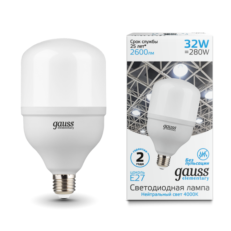 Лампа светодиодная T100 E27 32W 2600lm 4000K нейтральный белый 180-240V Gauss предназначена для замены галогенных и люминесцентных в помещениях с высокими потолками. Бренд GAUSS реализовал в этой модели баланс между яркостью, долговечностью и компактным форм-фактором - идеально подходит для офисов, складов и производственных зон.