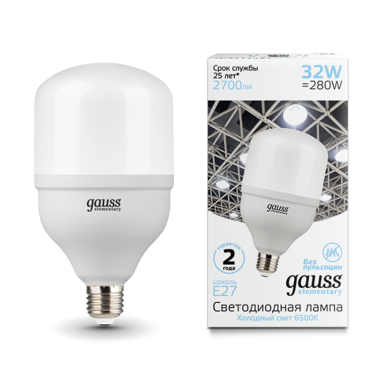 Лампа светодиодная LED T100 E27 32W 2700lm 6500K 180-240V Gauss используется там, где требуется яркий, равномерный белый свет на больших площадях. Подходит для офисов, складов, производственных цехов, торговых залов, автосервисов и других объектов с высотой потолков от 3,5 метров. Также применяется в общественных зонах - школьных коридорах, медицинских учреждениях, административных зданиях.