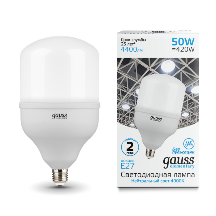 Лампа светодиодная Elementary Gauss T140 E27 50W 4400lm 4000K нейтральный белый 180-240V используется там, где требуется равномерное и яркое освещение больших площадей. Подходит для установки в торговые залы, ангары, мастерские, производственные цеха, административные помещения и другие объекты с высотой потолков от 3,5 метров. Нейтральный белый свет (4000 K) снижает глазную нагрузку и повышает восприятие деталей - особенно важен на рабочих местах.