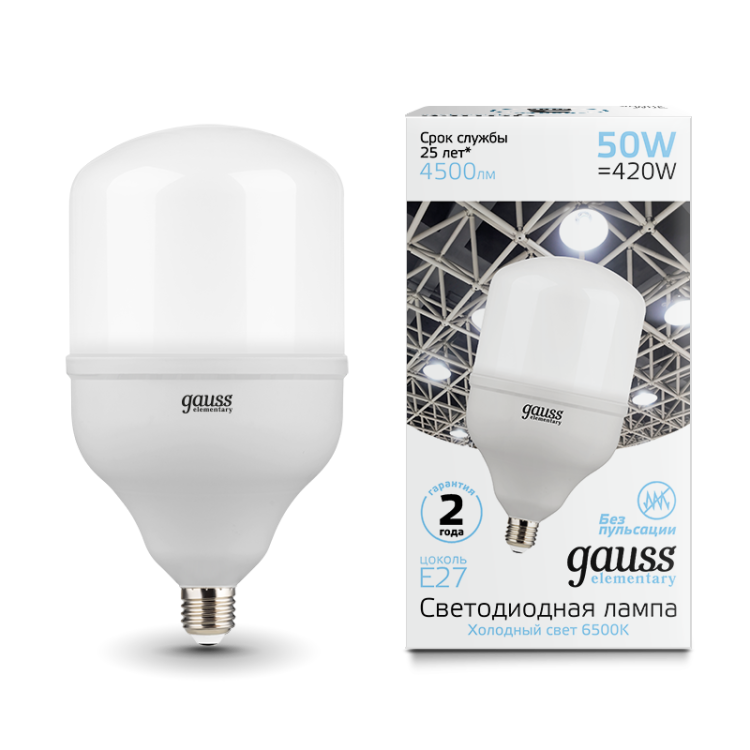 Лампа светодиодная Elementary Gauss T140 E27 50W 4500lm 6500K цилиндр холодный белый 180-240V предназначена для замены традиционных ламп в помещениях с высокими потолками - более 3,5 метра. Подходит для освещения складских комплексов, торговых залов, автосервисов, производственных участков, спортивных залов, административных зон и крупных жилых комнат. Установка возможна в любые светильники с патроном E27, совместимые с нагрузкой до 50 Вт.