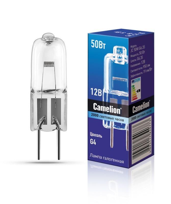 Лампа галогенная 50 Вт 12 В капсульная цоколь G6.35 от Camelion (арт. 1957) - компактный источник света для точечных светильников, прожекторов и других устройств, требующих яркого, тёплого свечения при низком напряжении.