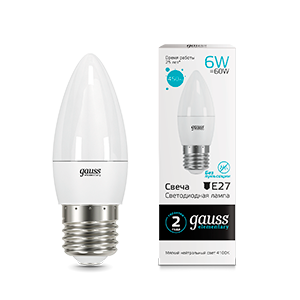 Лампа светодиодная 6 ватт 450 люмен 4100 кельвин свеча нейтральный белый E27 220 вольт от GAUSS (арт. 33226) - компактный источник света с формой колбы «свеча» для замены классических ламп накаливания в бытовых и офисных светильниках. Подходит для открытых и декоративных решений, где важна эстетика и равномерное рассеивание света.