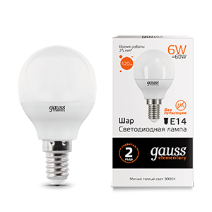 Лампа светодиодная 6 Вт 420 лм 3000К шар P45 E14 220В от GAUSS - энергосберегающая замена лампам накаливания с теплым белым светом, подходящая для повседневного освещения в жилых и офисных помещениях. Артикул 53116 обеспечивает надежную работу при напряжении 220 В и совместима с большинством бытовых светильников.