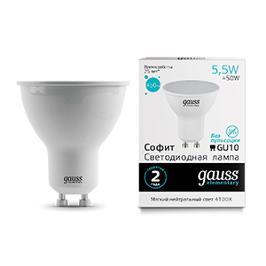 Лампа светодиодная 5.5 Вт 450 лм 4100К нейтральный белый GU10 MR16 220В от GAUSS - компактный источник света с высокой эффективностью и нейтральной белизной, предназначенный для замены галогенных ламп в точечных светильниках бытовых и офисных помещений.