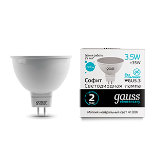 Лампа светодиодная 3.5 Вт 300 лм 4100К нейтральный белый GU5.3 MR16 220В от GAUSS - компактный источник света для замены галогенных ламп в точечных светильниках, подсветке мебели и интерьере. Благодаря низкому потреблению и хорошей цветопередаче, она подходит как для бытовых, так и для коммерческих помещений.
