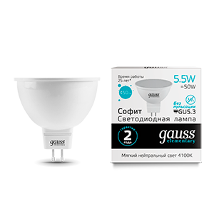 Лампа светодиодная 5.5 Вт 450 лм 4100К нейтральный белый GU5.3 MR16 220В от GAUSS - компактный источник света с высокой эффективностью и нейтральной белизной, предназначенный для замены галогенных ламп в точечных светильниках бытовых и офисных помещений.