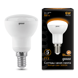 Лампа светодиодная 6 Вт 500 лм 3000К теплый белый R50 рефлектор E14 220В от GAUSS - энергоэффективная замена лампам накаливания и КЛЛ с формой R50 и цоколем E14. Подходит для точечного и акцентного освещения в жилых и офисных помещениях.
