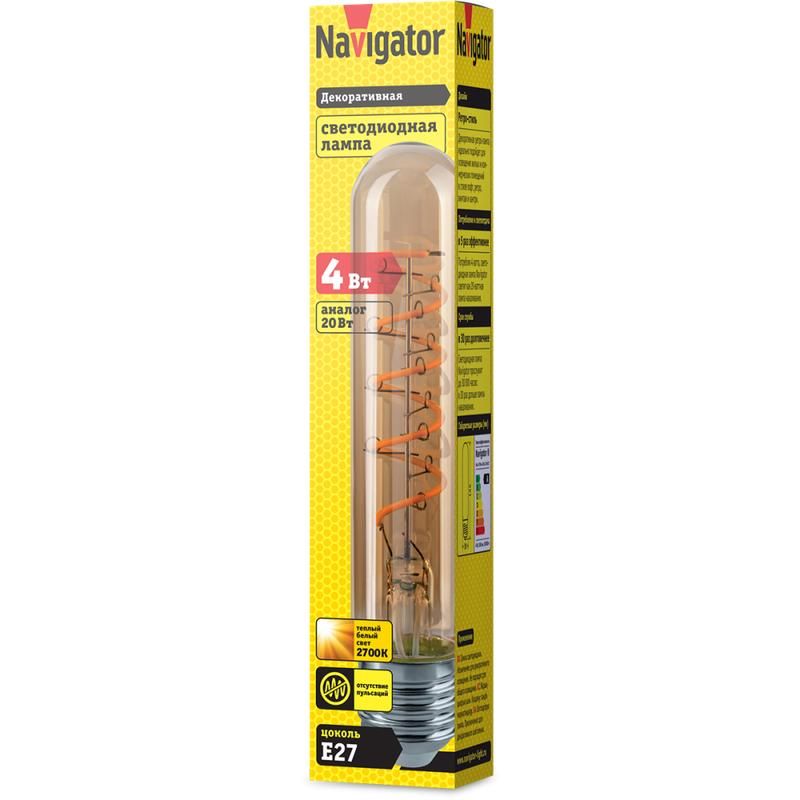 Лампа светодиодная NLL-F-T30-4-230-2.7K-E27 от бренда Navigator - компактная филаментная лампа с цоколем E27, предназначенная для замены классических ламп накаливания в бытовых и коммерческих осветительных системах. Модель отличается равномерным 360°-излучением, теплым белым светом и долгим сроком службы, что делает её удобной для установки в люстры, бра и настольные lamps.