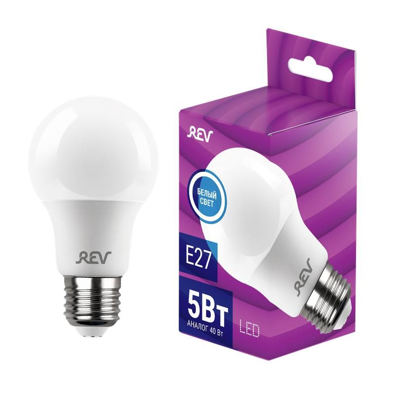 Лампа светодиодная 5 ватт A60 грушевидная 4000 кельвин нейтральный белый E27 420 люмен 180-240 вольт REV - компактный источник света с низким потреблением энергии, подходящий для замены обычных ламп накаливания в бытовых и офисных помещениях. Бренд REV обеспечивает надёжную работу при широком диапазоне напряжений.
