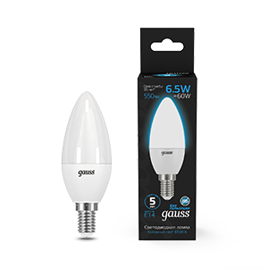 Лампа светодиодная 6.5Вт 550лм 6500К свеча холодный белый E14 AC 220В от GAUSS - компактный источник света с формой колбы «свеча» и холодным белым светом, подходящий для декоративного и функционального освещения в бытовых и офисных помещениях. Артикул 103101307 обеспечивает совместимость со стандартными патронами E14.