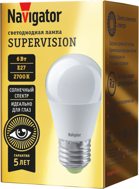 Лампа светодиодная NLL-G45-6-230-2.7K-E27-FR-SV - компактный источник света мощностью 6 Вт с цоколем E27, предназначенный для замены обычных ламп накаливания в бытовых и офисных помещениях. Бренд Navigator, артикул 80542, сочетает высокую светоотдачу, мягкое теплое свечение и повышенную безопасность для зрения благодаря технологии Supervision.