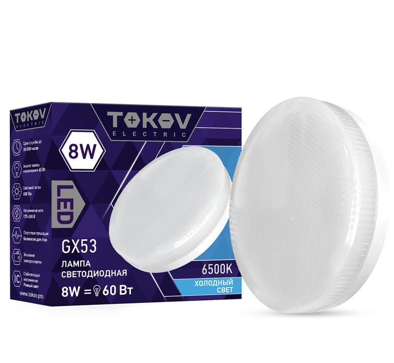 Лампа светодиодная 8 ватт 6500 кельвин цоколь GX53 напряжение 176-264 вольт от TOKOV ELECTRIC (артикул tke-gx53-8-6.5k) - компактный источник света для встраиваемых светильников с плоской формой колбы, подходящий для офисов, торговых зон и помещений с высокими требованиями к яркости освещения.