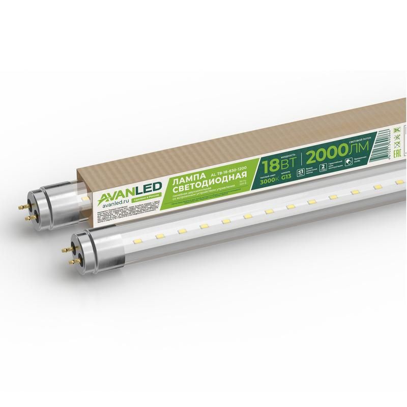 Лампа светодиодная T8-18-830-1200 18Вт прозрачная 3000К теплый белый G13 2000лм 195-265В от AVANLED - энергоэффективный аналог трубчатых люминесцентных ламп, предназначенный для замены в существующих светильниках с патронами G13. Подходит для офисов, складов, производственных помещений и других зон с высокими требованиями к освещению.