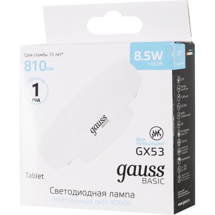Лампа светодиодная LED 8.5 Вт 810 лм 4000К AC180-240В GX53 таблетка нейтральный Basic Gauss - 20849292