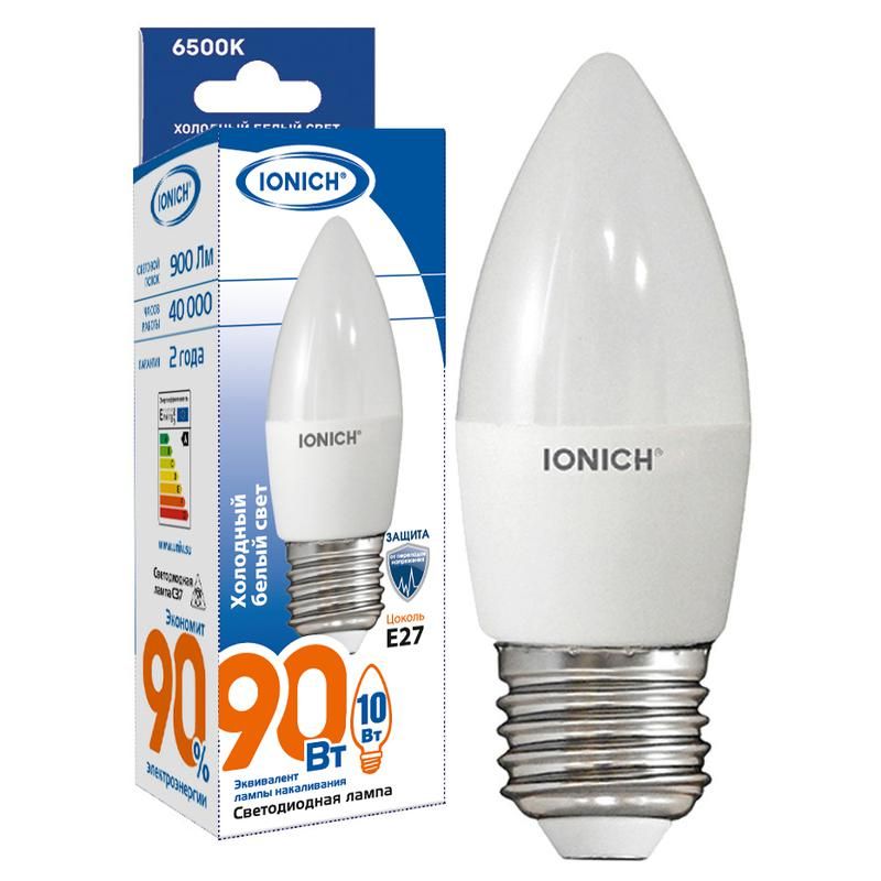 Лампа светодиодная C37 10Вт "Свеча" 6500К Е14 230В от бренда IONICH - компактный источник света с холодным белым цветом, подходящий для замены традиционных ламп накаливания в декоративных и функциональных светильниках. Артикул 1801 обеспечивает точную совместимость с патронами E14.
