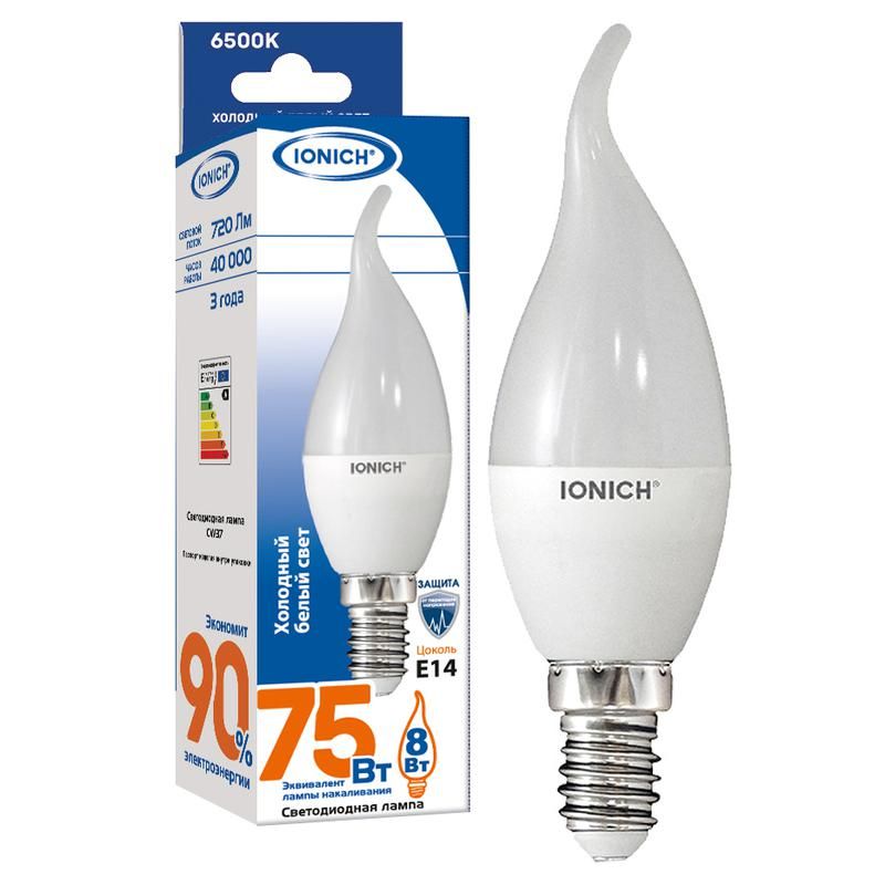 Лампа светодиодная 8Вт "Свеча" 6500К Е14 230В холодный белый от бренда IONICH (артикул 1639) заменяет традиционные лампы накаливания в светильниках с цоколем Е14, обеспечивая яркий холодный белый свет при минимальном энергопотреблении.