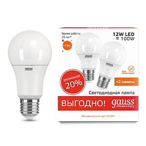 | Лампа светодиодная Elementary A60 12W 3000K E27 (2 лампы в упаковке) LED 1/50 | 23212P | Gauss | 26.02.2026 | Под заказ | 144,56 ₽ | уп. | от 30 дней |