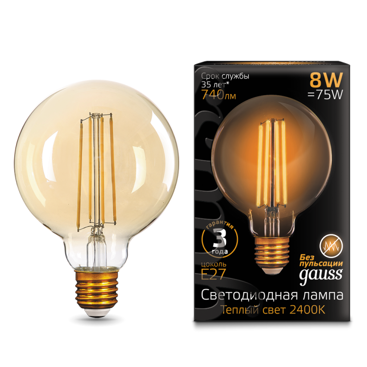 Лампа светодиодная филаментная LED 8 Вт 740 лм 2400К AC185-265В E27 шар G95 теплая золотистая колба Black Filament Gauss - 105802008