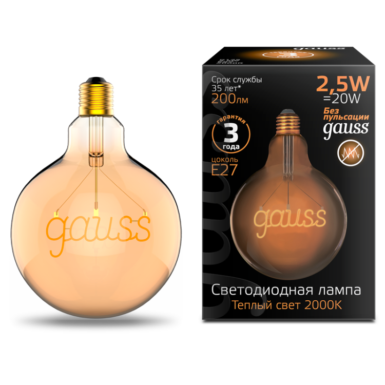 Лампа светодиодная филаментная LED 2.5 Вт 200 лм 2000К шар G125 теплый белый E27 AC 220В золотистая колба - компактный источник света с элегантной внешностью, подходящий для создания уютного декоративного освещения в интерьере. Бренд GAUSS предлагает эту модель как часть линейки, где дизайн и функциональность сочетаются с высокой цветопередачей и долгим сроком службы.
