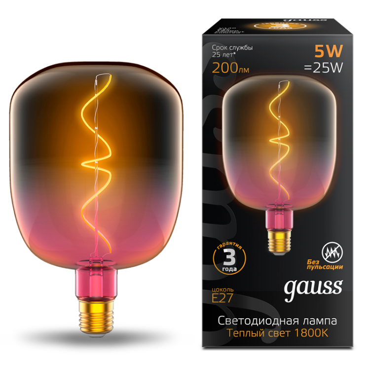 Лампа светодиодная филаментная LED 5 Вт 200 лм 1800К V140 E27 AC 220В розовая/теплая колба Flexible/Pink-Clear от GAUSS - это декоративный источник света с тёплым свечением и элегантным дизайном, идеально подходящий для создания уютной атмосферы в жилых и общественных помещениях.