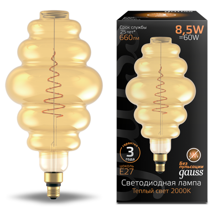 Лампа светодиодная филаментная LED 8.5 Вт 660 лм 2000К Honeycomb теплый/золотистый E27 AC 220В - это декоративный источник света с эффектом классической лампы накаливания, созданная для создания уютной атмосферы в жилых и общественных помещениях. Бренд GAUSS предлагает эту модель как часть серии Honeycomb, где сочетаются эстетика, высокая цветопередача и долгий срок службы.
