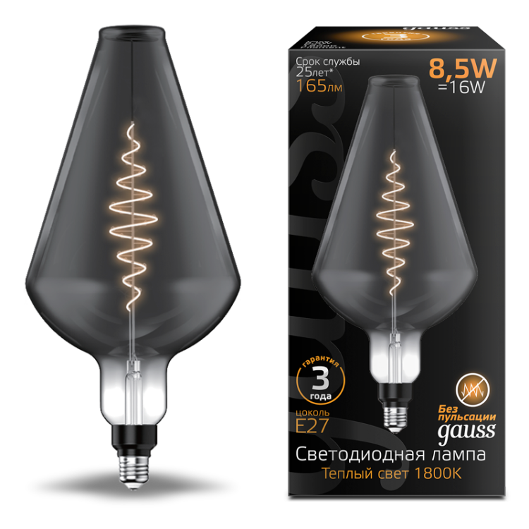 Лампа светодиодная филаментная LED 8.5 Вт 165 лм 1800К Vase теплый белый E27 AC 220В серая/тонированная колба Black Filament Gauss - это декоративный источник света с имитацией классической лампы накаливания, предназначенная для создания уютного освещения в жилых и общественных помещениях. Бренд GAUSS предлагает эту модель как элемент интерьера, сочетающий эстетику и надежную технологию.