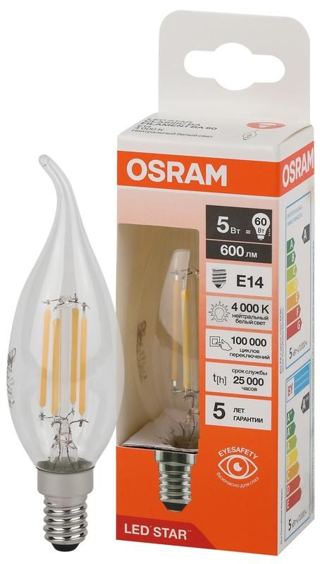 Лампа светодиодная филаментная 5Вт, 600Лм, 4000К, цоколь E14, 220-240В, серия LED Star от Osram - энергоэффективная замена лампам накаливания с классическим дизайном, подходящая для открытых светильников и декоративного освещения. Артикул 4058075684966.