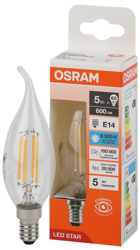 Лампа светодиодная филаментная LSCLBA60 5W/865 230VFILCL 5Вт 6500К холод. бел. E14 600лм BA угол пучка 300град. 220-240В (замена 60Вт) прозр. стекло OSRAM 4058075688131