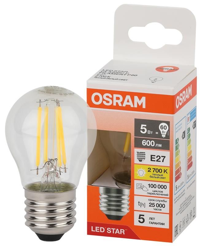 Лампа светодиодная филаментная 5Вт, 600Лм, 2700К, цоколь E27, 230В от Osram - энергоэффективная замена лампам накаливания с классическим внешним видом. Подходит для открытых светильников, интерьерного и декоративного освещения. Артикул 4058075684669.