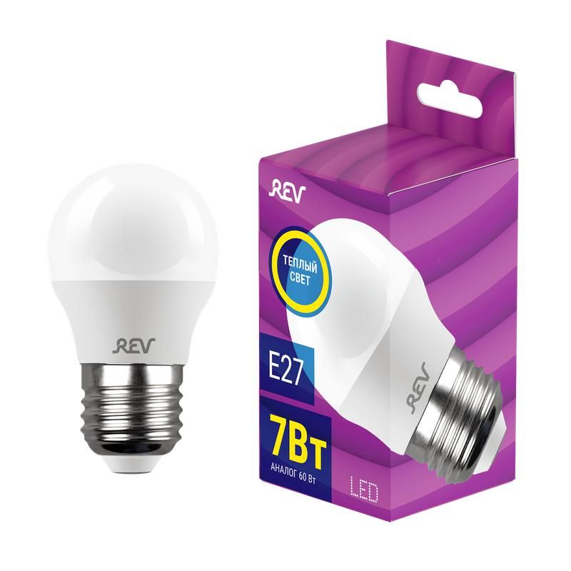 Лампа светодиодная шар G45 7Вт E27 2700К 600лм 180-240В REV - компактный источник света с теплым белым свечением, предназначенный для замены ламп накаливания в бытовых и декоративных светильниках. Бренд REV предлагает эту модель как надежную и экономичную альтернативу с длительным сроком службы.