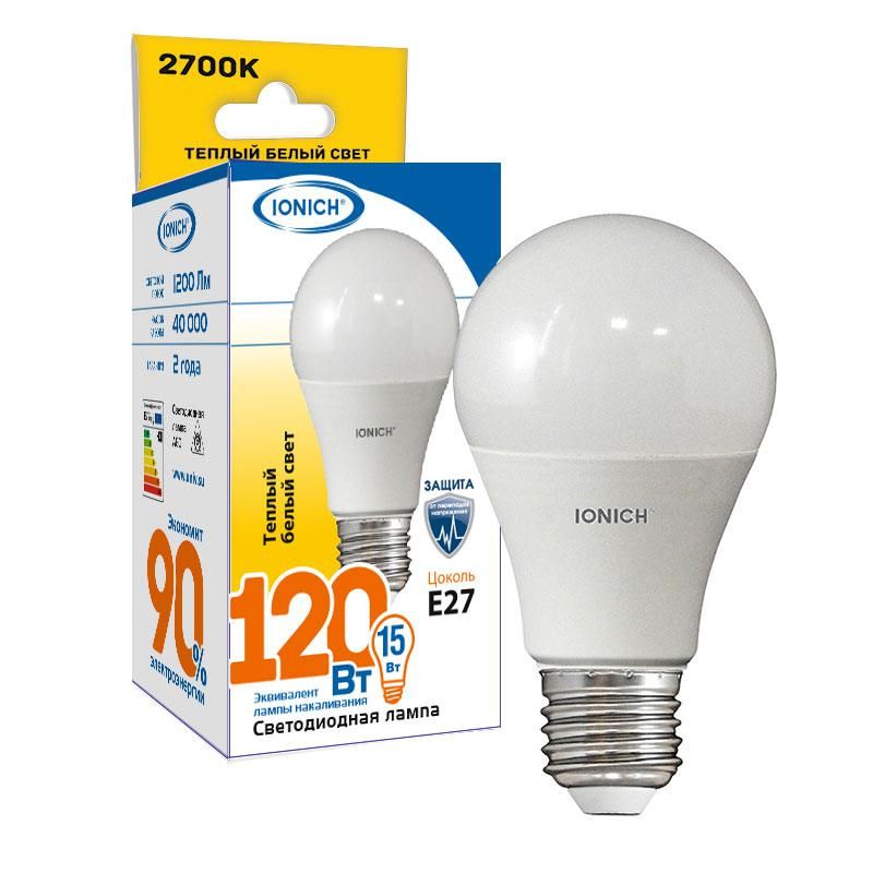Лампа светодиодная ILED-SMD2835-A60-14-1100-230-2.7-E27 от бренда IONICH - энергоэффективный источник света с тёплым белым цветом (2700 К) и цоколем E27, предназначенная для замены обычных ламп накаливания в бытовых и коммерческих помещениях. Артикул 1622 соответствует модели с мощностью 14 Вт и световым потоком около 1100 лм.