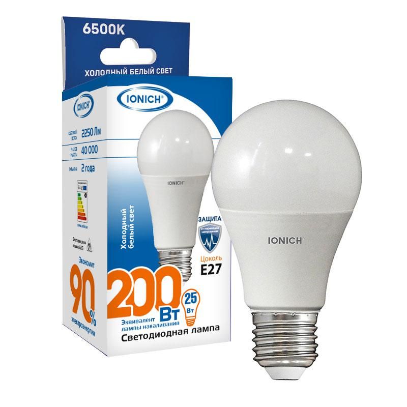 Лампа светодиодная SMD2835 A65 24V 2160lm 220V 6.5W E27 от бренда IONICH - энергоэффективный источник света с цоколем E27, предназначенный для замены традиционных ламп накаливания в бытовых и промышленных осветительных системах. Несмотря на указание напряжения 24 В в названии, лампа рассчитана на работу от сети 220 В, что делает её совместимой со стандартными патронами.