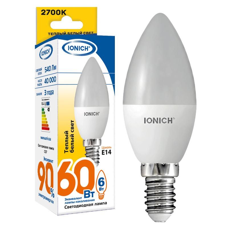 Лампа светодиодная SMD2835 C37 8 Вт 720 лм 220 В 2.7 Вт E14 от бренда IONICH - компактный источник света с цоколем E14, предназначенный для замены традиционных ламп накаливания в бытовых и легких промышленных условиях. Эта модель обеспечивает равномерное освещение при минимальном энергопотреблении.