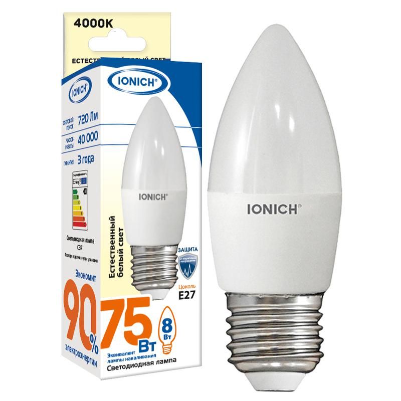 Лампа светодиодная SMD2835 C37 8 Вт 720 лм 220 В E27 от бренда IONICH - энергоэффективный источник света с классическим цоколем E27, подходящий для замены обычных ламп накаливания в бытовых и офисных помещениях.