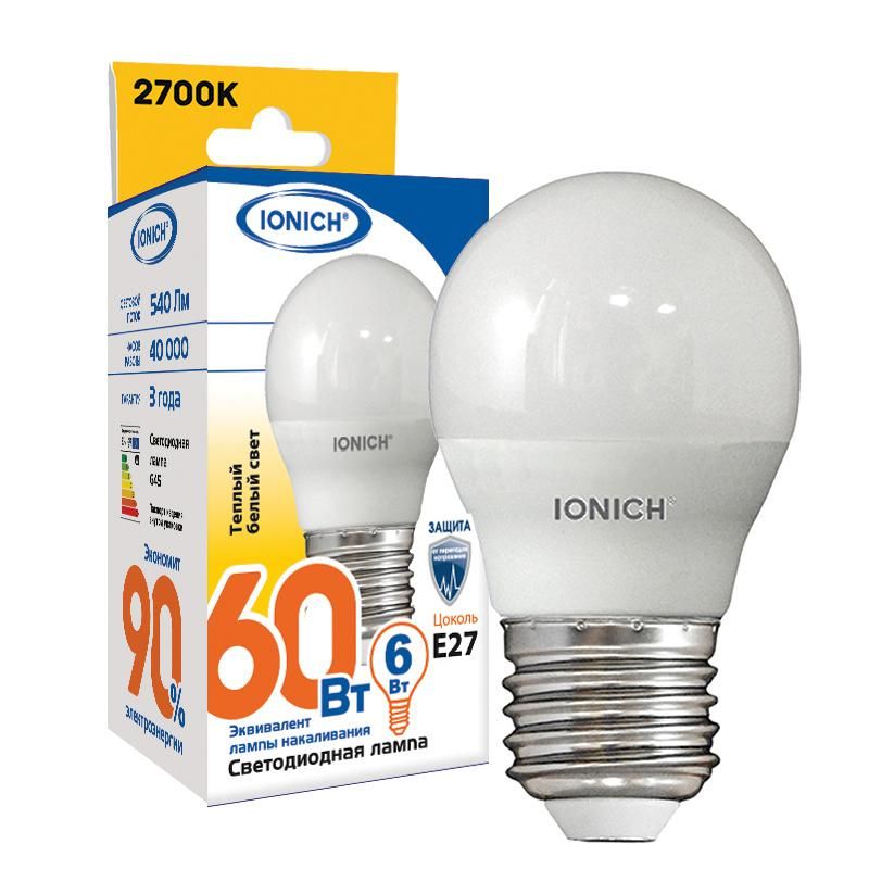 Лампа светодиодная SMD2835 G45 6 Вт 540 лм 220 В 2.7 В E27 от бренда IONICH - энергоэффективный источник света с цоколем E27, подходящий для замены обычных ламп накаливания в бытовых и офисных условиях. Артикул 1564 обеспечивает совместимость со стандартными патронами.