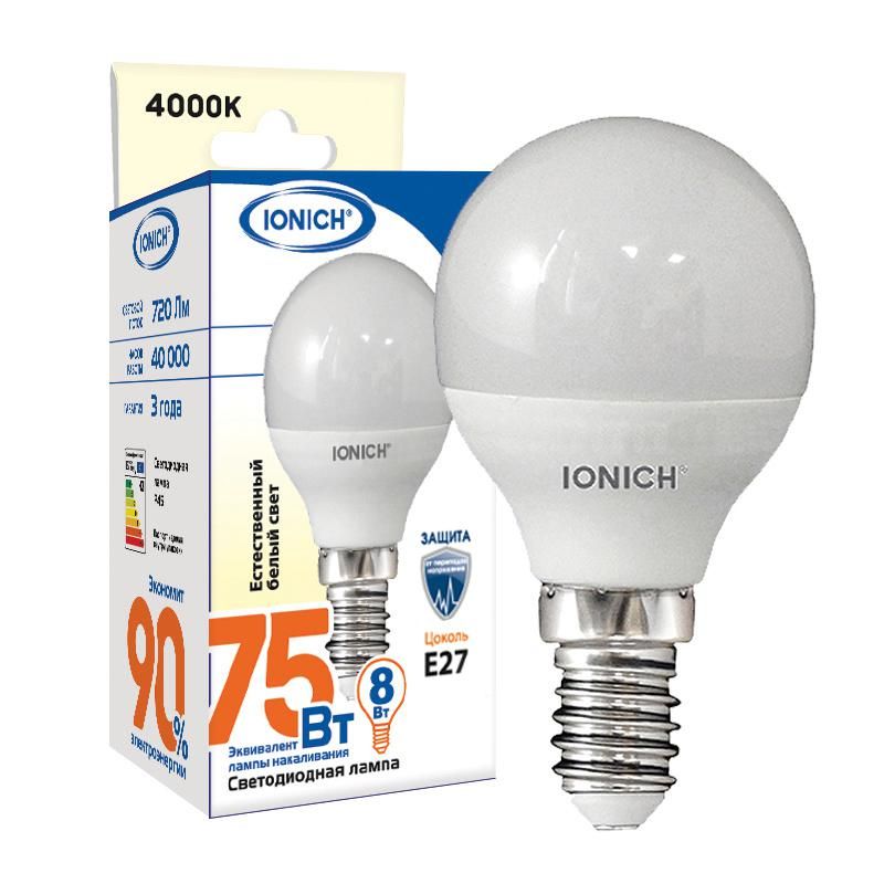 Лампа светодиодная ILED-SMD2835-P45-8-720-220-4-E14 от бренда IONICH предназначена для замены традиционных ламп накаливания в бытовых и светотехнических устройствах с цоколем E14. Её компактный формат, высокая эффективность и долгий срок службы делают её подходящим решением для настольных ламп, потолочных светильников и декоративной подсветки.