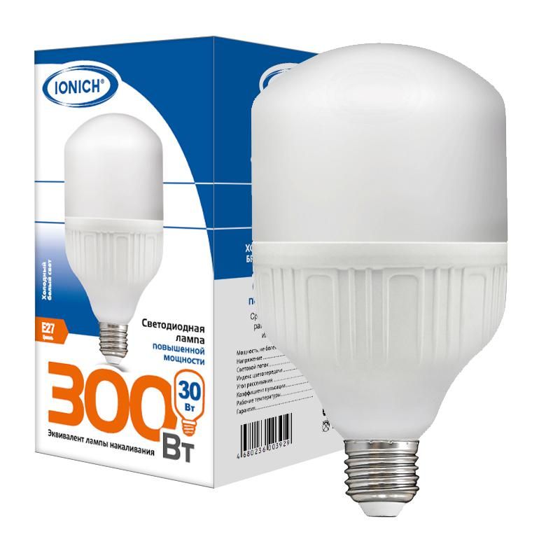 Лампа светодиодная ILED-SMD2835-Т100 30 Вт с цоколем E27 заменяет традиционные лампы накаливания до 150 Вт, обеспечивая яркий холодный белый свет (6500 К) и высокую эффективность - 2700 лм при потреблении всего 30 Вт. Бренд IONICH предлагает эту модель как надёжное решение для освещения помещений с повышенными требованиями к яркости.
