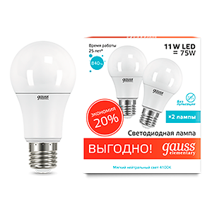 Лампа светодиодная LED 11 Вт 840 лм 4100К AC180-240В E27 А60 (груша) нейтральный (промоупаковка 2 лампы) Elementary Gauss - 23221P