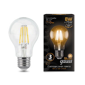 Лампа светодиодная филаментная 8 Вт A60 грушевидная 2700К теплый белый E27 740 лм 220В от GAUSS заменяет классические лампы накаливания, сохраняя их внешний вид, но потребляя в 5–6 раз меньше электроэнергии. Подходит для бытового и офисного освещения, особенно там, где важно эстетическое восприятие светильника.