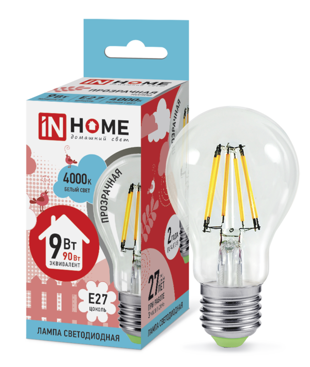 Лампа светодиодная LED-A60-deco 9Вт грушевидная прозрачная 4000К нейтр. бел. E27 1040лм 230В IN HOME 4690612008073