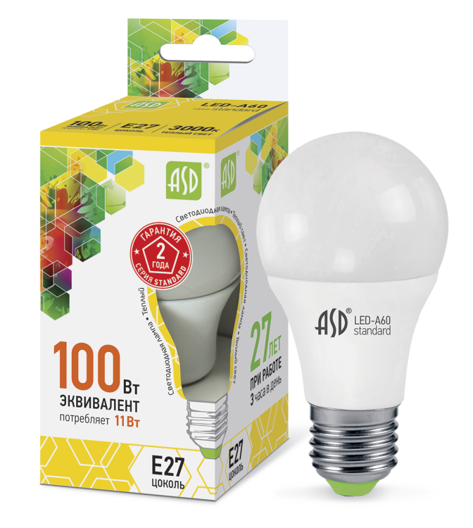 Лампа светодиодная LED-A60-standard 11Вт грушевидная 3000К тепл. бел. E27 990лм 160-260В ASD 4690612001739