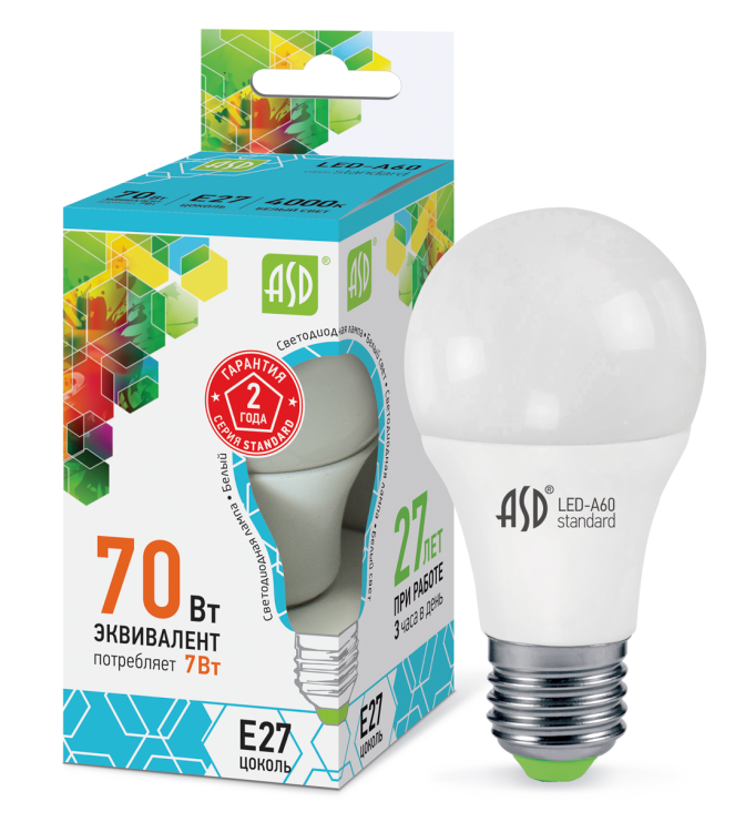 Лампа светодиодная LED-A60-standard 7Вт грушевидная 4000К нейтр. бел. E27 630лм 160-260В ASD 4690612001678