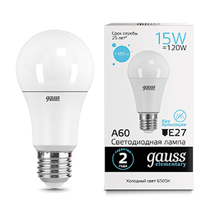 Лампа светодиодная 15 Вт A60 грушевидная 6500К холодный белый E27 1480 лм 220В от GAUSS - энергосберегающая замена лампам накаливания с холодным белым светом, подходящая для повседневного освещения жилых и офисных помещений. Артикул 23235 из серии Gauss Elementary сочетает надежную конструкцию и доступную цену.