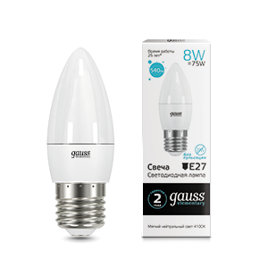 Лампа светодиодная 8 Вт 540 лм 4100К нейтральный белый E27 220В от GAUSS - компактный источник света с цоколем E27, подходящий для замены обычных ламп накаливания в бытовых и офисных светильниках. Её форма свечи и нейтрально-белый свет делают её идеальной для открытых плафонов, бра и люстр.